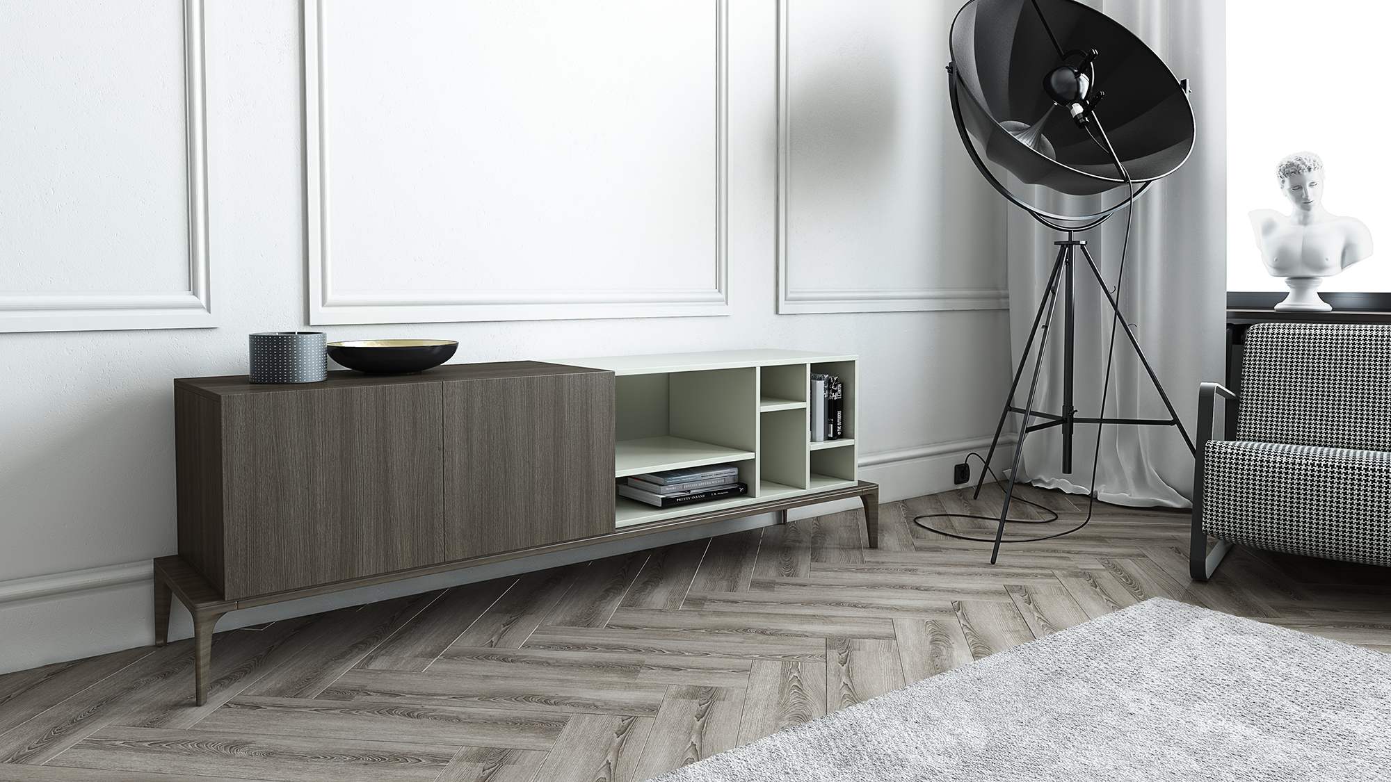 Βάση σε δρυς και μασίφ πόδια οξιάς. Ντουλάπι με δύο πόρτες
