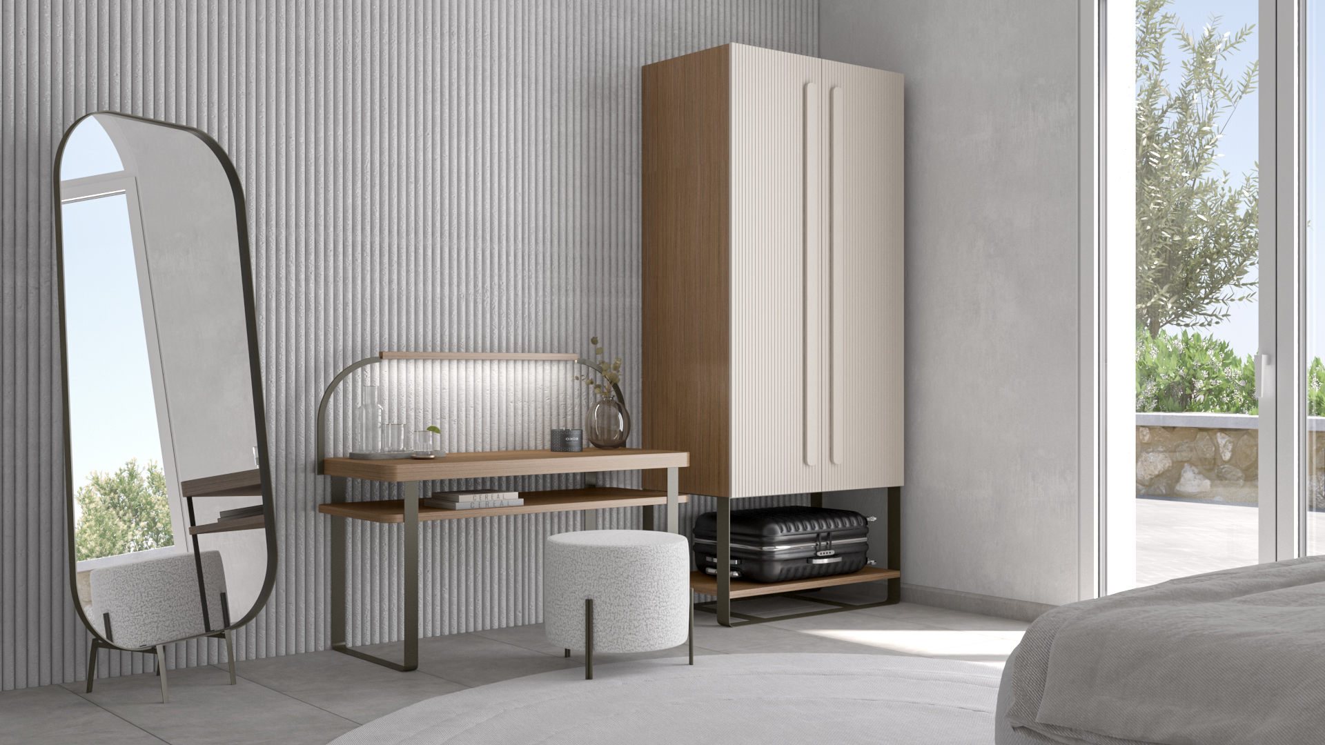 Reflex est conçu pour un confort pur qui vous donnera envie de vous détendre et de profiter pendant heures à la fois. Tête de lit double avec lumière led en option et étagères cachées pour garder tous vos essentiels. Tête de lit arrière en bois laqué roseau .Tête de lit avant et cadre recouverts de tissu . Table de chevet avec structure en métal et tiroir en bois laqué et plateau plaqué en chêne ou noyer.Armoire avec portes en bois laqué roseau. Bureau en chêne avec barre led en option. Miroir au sol Bristol.