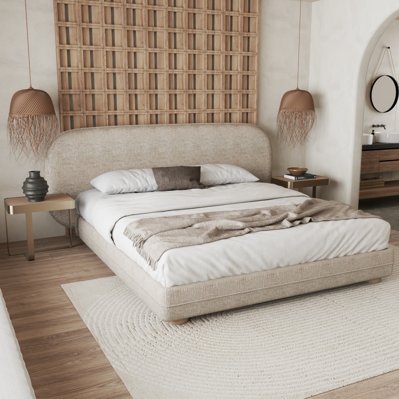 Bed upholstered in fabric of customer ‘s choice.